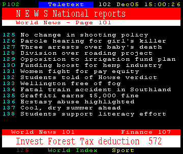This page features up to 15 current news articles relating to current news and events that are happening around New Zealand (International News Index is on Page 101) TVNZ is New Zealand’s leading Television provider, and has extensive News resources that are provided to Teletext The bottom of the page features an Advertising Banner |