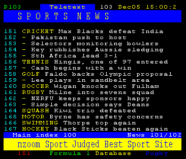 New Zealand is a nation of sports fanatics, and Teletext provides the latest information on a huge variety of sporting codes from across the world. The sports database provides more than 100 pages of information and statistics from the English Soccer League, American NFL and NBL, Formula 1, WRC, Louis Vitton and Americas Cup Sailing, International Cricket and Rugby, just to mention a few. |