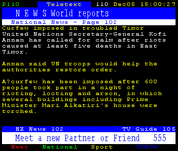 Television New Zealand (through its own resources and other international sources) is the country’s leading broadcaster of International and National News. Teletext provides around 60 pages of the most up to date International, National, and Business News, and Sports articles, which are updated continuously throughout the day. |