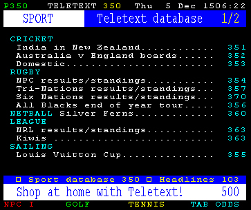 Teletext currently offers 17 pages of Sports News, which is provided by TVNZ’s worldwide network of contacts. This information is updated throughout the day. In addition to Sports news, Teletext provides a Database of Information and Sporting Statistics on more than 20 different International Sporting Codes. This information is available on Page 350. |