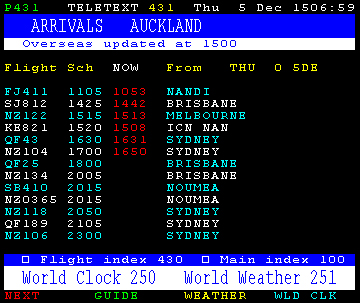 This screen shot shows a Page of International Aircraft Arrivals into Auckland Airport on TVNZ’s Teletext service Air New Zealand is this country’s principle airline. They provide both Domestic and International flights and operate from all key airports. Air NZ has been a service provider to Teletext for more than 10 years. Not only is the information available on Teletext a valuable public service, it is also used by Air NZ as the principle information source at a number of regional airports. Because the VHF broadcast signal provided by TVNZ reaches more than 99.7% of geographical locations across New Zealand, Teletext has cost advantages of providing this type of information to remote locations that would be too expensive to reach with an IP connection. This information is updated automatically to Teletext directly from Air NZ’s database every 15 minutes. |