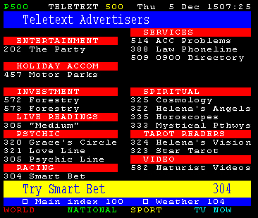 Because there is such a vast collection of information and services available on Teletext, page 500 provides a complete and comprehensive index to viewers. |
