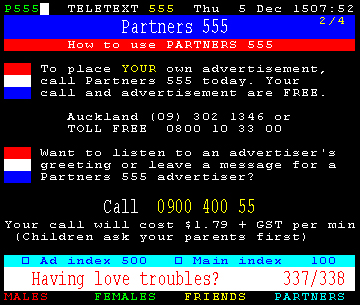 Partners, is a New Zealand wide Dating and Connection service that use Teletext to provide information on people looking for Love or Companionship. Currently this service has more than 100 contacts. The information is updated weekly. |